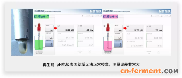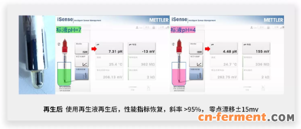 当粘附在电极表面的结垢用水、盐酸、氢氧化钠溶氧均无法清除时,我们往往就认为这支pH电极“报废”了,给企业带来高昂的运行成本。通过梅特勒-托利多专业工程师现场分析后,采用再生液再生后,维修间所有的“报废”电极均恢复和活力,斜率 >95%, 零点漂移±15mv,完全可以继续安装至工艺点使用。