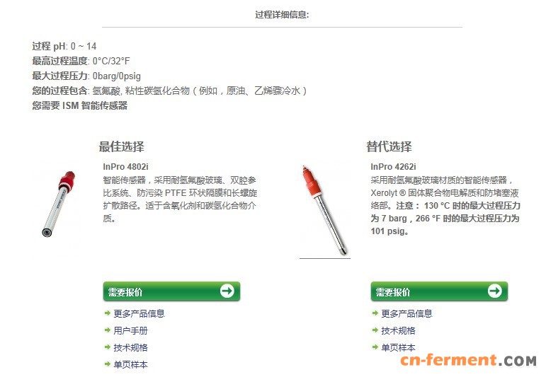 Step3. 网站会为您的工艺推荐最合适的pH传感器,还可以查看该型号的技术文件。