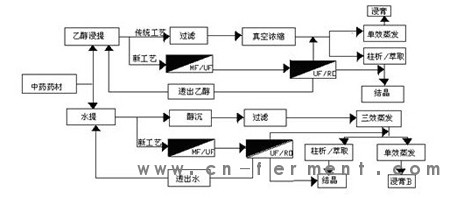 用过滤技术集成膜分离技术系统对中药和植物水提液直接进行澄清、分级纯化、浓缩,可以取代二次醇沉、以用树脂吸附工序,直接去除靴质、胶体、植物纤维、大分子蛋白用细菌等杂质,透过液澄清透、纯度高,如采用膜分离浓缩澄清液可以脱除盐份和水,得到高纯度的浓缩液。