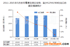 2011-2015年5月林可霉素及其衍生物、盐进出口数据及趋势