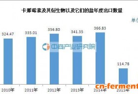 2016年前4月卡那霉素及其衍生物以及它们的盐出口32.55吨
