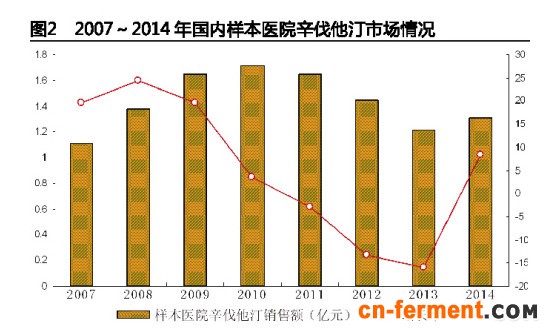 据中国医药工业信息中心数据,2014年国内22个城市样本医院辛伐他汀用药金额为31亿元,比上一年增长了8.26%;2014年,辛伐他汀在北京样本医院市场用药金额为3594万元,比上一年同期下滑了0.75%;上海市场用药金额为1851万元,比上一年同期下滑了5.71%;广州是2327万元,比上一年同期增长了9.76%。