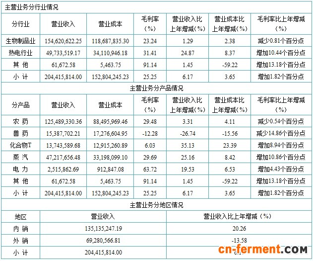 报告期内,公司继续做好产销衔接、提升产品质量、控制生产成本、加强内控实施等方面工作,但由于受周边土地资源、环保等因素影响,公司在维持原有产能的基础上,根据销售情况,调整产品结构。农药方面,就赤霉素而言,公司依据去年水稻制种种植面积周期性大幅下降,积极寻求解决方案,积极开拓国内市场赤霉素产品销售渠道,主要在我国北方、西北(新疆)水果区域逐步建立销售网络;外销比上年同期减少1,166万元,主要由于传统销售市场如西班牙,比利时等欧洲地区有所下降,新兴市场如南美,印度,越南等发展迅猛,但由于公司产品后续配套问题,制约了产能的放量。