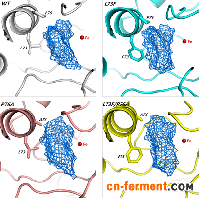 儿茶酚1,2-双加氧酶可将儿茶酚转化为粘康酸,然后经过化学氢化获得己二酸(图1)。为了提高和改善儿茶酚1,2-双加氧酶的性能,基于Acinetobacter sp. ADP1的儿茶酚1,2-双加氧酶CatA的蛋白晶体结构信息,通过分子建模确认G72、L73和P76是影响酶活的关键氨基酸残基,定点突变发现L73F、P76A以及L73F/P76A可以有效提高突变体的酶活,最高达10倍左右。进一步的动力学表征也显示突变可以增加酶的反应速度。发酵实验表明,突变体相比出发株粘康酸产量提高超过25%。进一步计算模拟解析了突变的分子机制,研究发现引入突变后可以使酶的底物结合腔变大,从而导致底物容易进入结合腔,加快酶反应速度,增加酶活性(图2)。