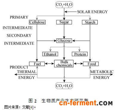 太阳能是地球上几乎一切能量的源泉,生物质是太阳能循环转化的载体,现代工业发展的能源基础——煤炭、石油、天然气就是古代生物质埋藏在地下,经微生物和地质化学的共同作用演变而来。人类使用能源的趋势为生物质—煤—石油—煤—生物质,人类通过改变利用方式来提高能源的利用效率。生物质转化为生物能源替代煤、石油和天然气等化石能源符合CO2+阳光—农作物—生物质能源—CO2的C平衡(图2),形成一个理论上的CO2净排放为零的物质循环。如果完全用生物质替代化石能源,生物质能源如生物乙醇在生产、运输过程中的CO2排放量,等同于化石能源在开采、运输过程中的CO2排放量,但是替代能源可以通过能源利用方式和利用效率的改善,减少CO2排放量。此外,生物燃料在加工过程中最大限度地去除了N、S等杂质,是更加绿色的能源,因此使用生物质能源替代化石能源,符合低碳经济减少CO2排放的要求,可以大大减少大气中其他污染物的浓度,对环境保护具有重要意义。