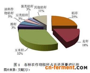 农作物秸秆是地球上第一大可再生资源。国家农业部完成了首次全国农作物秸秆资源专项调查,并发布了《全国农作物秸秆资源与评价报告》。据调查统计显示(图1),2009年,全国农作物秸秆理论资源量为8.20亿t(风干,含水量为15%);从品种上看,稻草约为2.05亿t,占理论资源量的25%;麦秸为1.50亿t,占18.3%;玉米秸为2.65亿t,占32.3%;棉秆为2584万t,占3.2%;油料作物秸秆(主要为油菜和花生)为3737万t,占4.6%;豆类秸秆为2726万t,占3.3%;薯类秸秆为2243万t,占2.7%[3]。