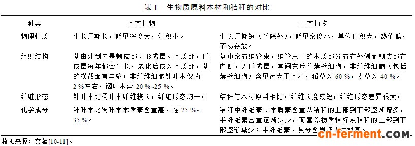 生物质原料是生物质产业之本,包括废弃生物资源(农林废弃物、禽畜粪便、有机垃圾、有机废水等)、专用能源作物(木薯、甘薯、甜高粱、菊芋等)、专用能源植物(黄连木、麻风树、油桐、文冠果、光皮树、乌桕等)。农作物秸秆是最具有代表性的木质纤维素资源。秸秆和木材同属于木质纤维素,都由纤维素、半纤维素和木质素组成,然而两者在结构和化学组成上却有较大的差异,其转化特性也不同(表1)。