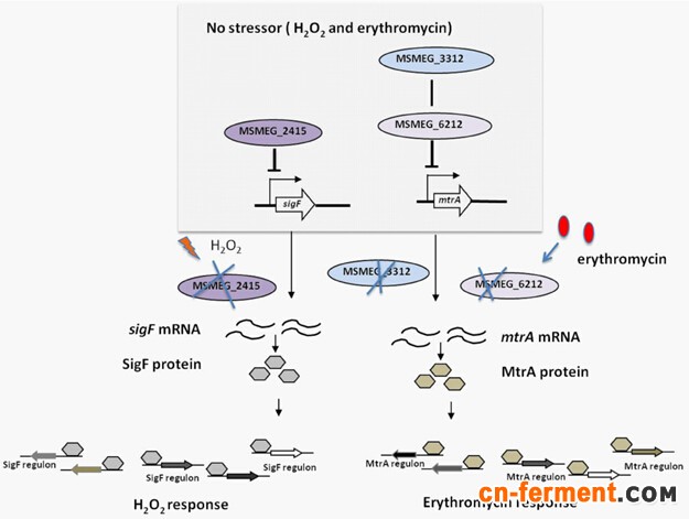 耻垢分枝杆菌是研究结核分枝杆菌的模式菌株,其有三个蚯蚓血红蛋白MSMEG_2415、MSMEG_3312 和MSMEG_6212。中国科学院微生物研究所米凯霞组研究人员首次通过基因敲除、回补、基因过表达技术以及药筛、启动子调控实验,发现了MSMEG_2415在转录水平调控选择性sigma因子SigF的表达来抑制细菌对过氧化氢H2O2的敏感性。相关研究2015年1月发表在杂志Frontiers in microbiology(doi: 10.3389/fmicb.2014.00800)上。