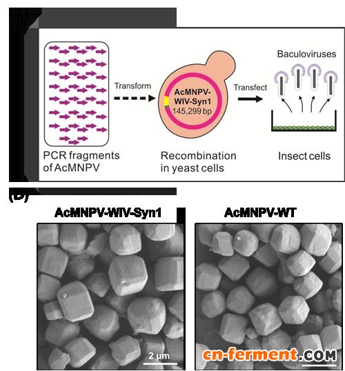 研究人员首先利用PCR扩增覆盖AcMNPV全基因的~45个片段,每个片段约3kb,相邻片段之间有大于60 bp的重叠序列。然后利用TAR技术,在酵母细胞内进行了三次重组,依次获得了9个~15 kb的片段、3个~45 kb的片段和全基因组(145,299 bp)。将合成的病毒基因组进行了454测序验证,通过转染昆虫细胞成功获得了有感染性的人工合成病毒AcMNPV-WIV-Syn1(图A)。电镜、一步生长曲线和生物测定等结果表明,合成病毒与亲本病毒具有相似的生物学特性(图B)。