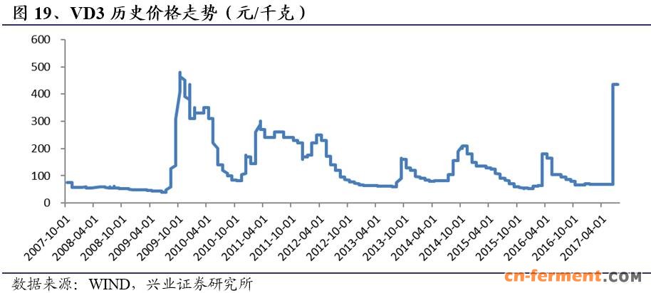 尽管VD3属于小品种维生素,但由于上游羊毛脂价格的供给及价格波动,维生素D3历史上在2009年8月-2010年10月,2010年12月-2012年8月,2013年8月-2013年12月经历了三次大幅的价格波动,在2009年6月份最低价格为40元/kg,在2009年10月份最高价格达到了480元/kg,涨幅高达1100%,波动十分剧烈。回顾过去几次上涨,2009年主要是由于厂家联合控制原材料供给,2011年为花园高科借金达威维生素A/D3产品检测出抗生素杂质之机,再次通过控制原料供给进行提价,2013年的上涨则主要是由于产品价格已经跌至成本线附近,行业集体提价确保利润,但由于供给格局已经较此前有所变化,产能整体过剩,再加上并没有原材料供应紧张或价格大幅上涨的刺激,因此提价幅度较前两次上涨明显收窄,2016年由于环保议题产能受限,VD3价格再次整体上浮。维生素D3主要厂家集中在浙江,花园生物,新和成、海盛制药等。中央环保督查组于2017年7月份进入浙江,受此消息剌激影响,维生素D3厂家停止报价。