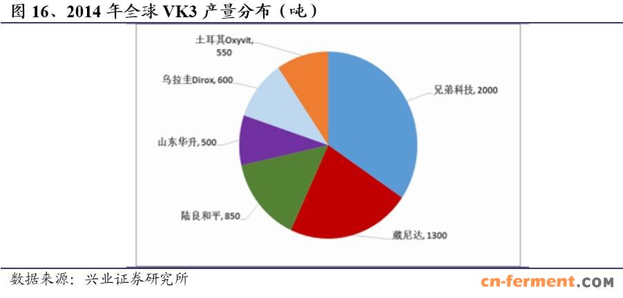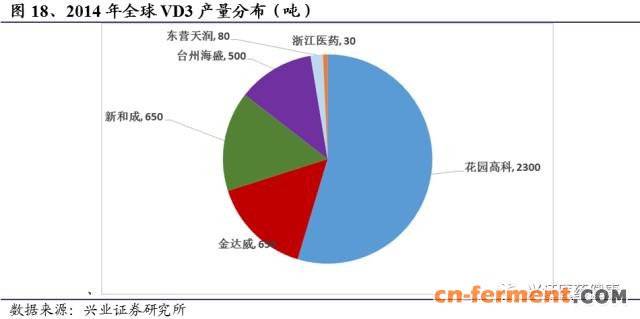 目前,维生素D3的主要生产厂家有花园高科、帝斯曼DSM、金达威、海盛化工、新和成、浙江医药、Fermenta等,技术壁垒较高,价格弹性大。目前全球VD3产能约10000吨,其中浙江花园高科是行业的龙头,产能达到5000吨,以3000余吨的年产量占据全球约45%的市场份额,近两年已打造从羊毛脂到NF级胆固醇再到多品种VD3的上下游产业链,气胆固醇产能扩建至200t,切入25-羟基维生素D3高端市场,2015年底帝斯曼DSM与花园生物签署了为期10年的胆固醇《采购协议》,其主导低位更加突出。