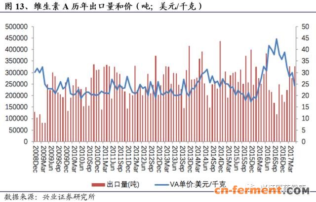 政策面,此前由于环保因素山东新发泛酸钙生产线停产整改导致泛酸钙供货紧张,价格曾到达高位。兄弟科技5000吨产能的泛酸钙生产线2016年12月已获生产许可,但迟迟未开始生产。安徽泰格维生素实业有限公司拟建设6000 吨/年泛酸钙项目,投产日期约2018年10月。2017年6月起,由于山东环保严查,山东新发和山东华辰可能经历长时间整改和停产,后续8月初左右环保组将进入浙江严查,亿帆医药浙江泛酸钙厂区也可能面临一定的检修停产预期。