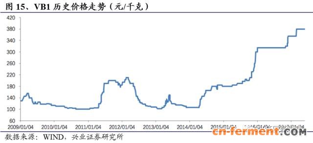 维生素B1:17年6月均价380元/千克,环比持平,目前价格为380元/千克。2015年以来,维生素B1受环保影响,上游原料供应紧张;市场格局也较为稳定,产能没有扩张,因此价格有望稳定高位。