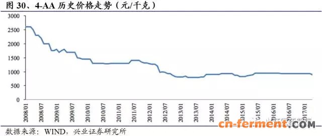 4-AA历史价格回顾:2008年以前,日本企业拥有生产4-AA的技术,国内主要是进口产品,当时价格高于2500元/千克。随着海翔等国产企业在技术上取得进展进入该行业后,价格渐进性下降,目前以海翔为代表的企业不仅赢得了国内市场,在国际市场上也拥有话语权,4-AA的生产正在向国内转移。