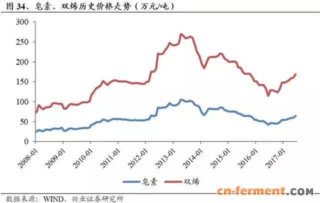 双烯未来价格展望:2017年6月均价105万元/吨,环比上涨3.96%,目前报价105万元/吨。我们认为,2015年以来双烯、皂素价格持续走低,主要是由于甾醇路线技术逐渐成熟,产品需求出现下降,2016年以来呈恢复性增长态势,预计后续价格仍将保持低位反弹势头,但仍需密切关注环保的执行力度。相关公司:仙琚制药、天药股份。