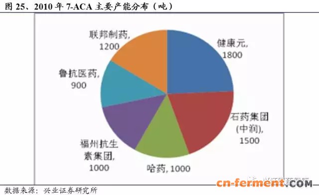 头孢菌素品种几均为半合成产品,即利用发酵头孢菌素C的裂解物7-ACA加化学侧链缩合而成,故7-ACA是合成头孢菌素的关键性中间体。2010年,全球7-ACA的需求量为4000多吨,而我国国内的产能接近8000吨,行业产能过剩较为严重。其主要的生产企业有健康元、石药集团、联邦制药等。其中健康元产能约1800吨,是市场的龙头。