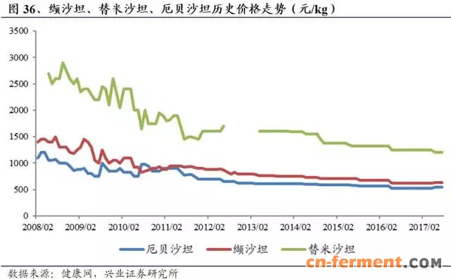 沙坦未来价格展望:2017月6月均价显示:缬沙坦635元/千克,价格环比持平;替米沙坦1200元/千克,价格环比持平;厄贝沙坦540元/千克,价格环比持平。我们认为随着这两类沙坦仿制药的兴起,对原料药需求的增加,价格短期内大幅下跌的可能性不大,但会呈现逐步走低的趋势。相关公司:华海药业。