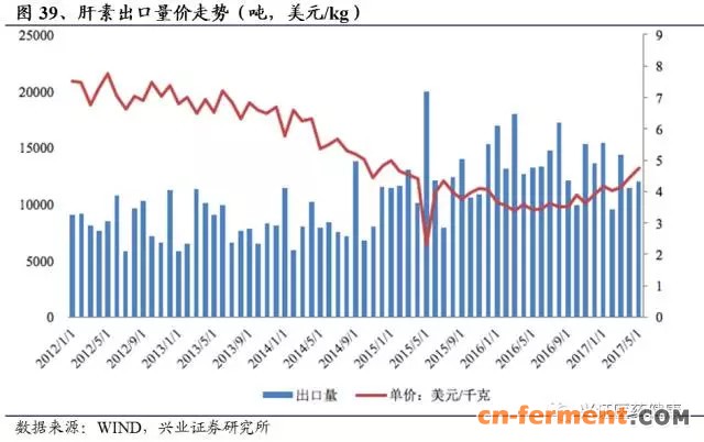 肝素:2016年全年肝素出口量为170.15吨,同比上涨13.96%。2017年5月出口量为12吨,同比下降9.42%,环比增长5.4%,出口量小幅回升;价格方面,5月份出口均价4761.32美元/千克,环比上涨6.95%。