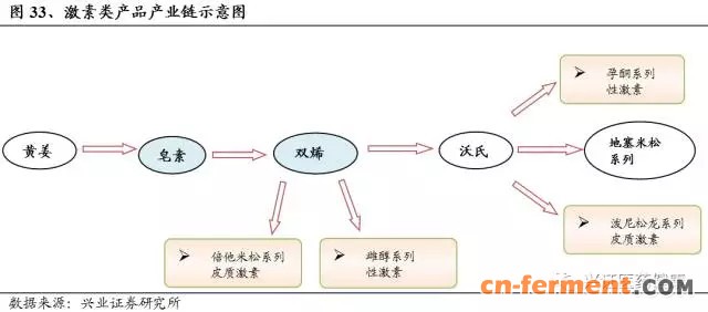 目前,国内甾体药物生产的工艺路线主要有两种:一种是以黄姜等薯蓣科植物为起始原料,通过提取薯蓣皂素进行化学合成的方式,制取双烯等甾体药物核心原料(即“黄姜-皂素-双烯类-甾体药物原料药及制剂”的传统工艺路线),并进一步生产成甾体药物;另一种是以玉米、 大豆等谷物或木浆为原料,从中提取植物甾醇,并通过微生物转化的方式,制取雄烯二酮、9-羟基雄烯二酮、雄二烯二酮等甾体药物核心原料(即“谷物-植物甾醇-雄烯二酮类-甾体药物原料药及制剂”的生物技术路线),并进一步生产成甾体药物。(仙琚制药和天药股份)