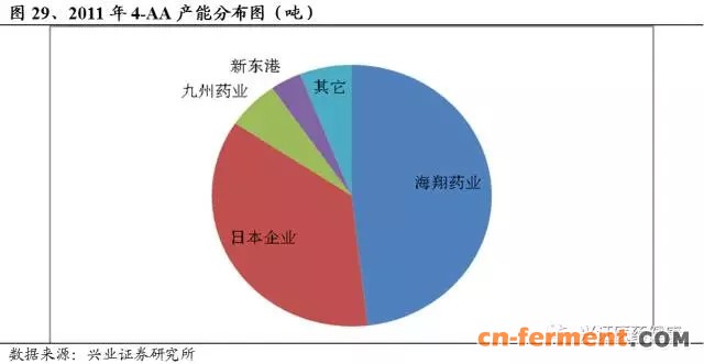 在产能分布上,国内亿帆药业产能最大,约为8000吨。2011年日本地震后,由于基础设施被破坏,日本第一精化暂停了泛酸钙的生产。我们认为,在该品种上,第一精化盈利情况并不理想,地震破坏了生产所需的基础设施,影响较为严重,未来有可能退出泛酸钙市场。目前全球仅亿帆药业、山东新发、山东华辰、巴斯夫、帝斯曼5家生产企业,其中亿帆药业与山东新发两家市场占有率超过70%。