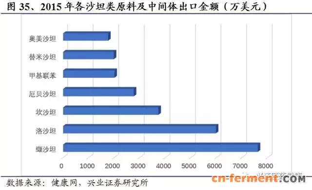 沙坦类原料药主要用来制备沙坦类抗高血压药物,主要品种有氯沙坦、缬沙坦、厄贝沙坦、坎地沙坦、替米沙坦、奥美沙坦以及主要中间体沙坦联苯等,前三种销售量最多。中国沙坦类原料规模较大的品种主要有:洛沙坦、缬沙坦、厄贝沙坦,另外是沙坦类母核中间体:2-氰基-4-甲基联苯。