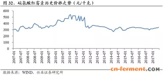 硫氰酸红霉素:17年6月均价340元/千克,环比上涨3.03%。16年开始报价区间在290-340元/千克范围内波动,预计后续将持续小幅波动。