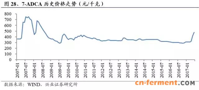 7-ADCA:17年6月均价480元/千克,环比上涨14.29%,目前价格480元/千克,实际报价在370元/kg左右。受青霉素工业盐涨价影响,产品报价也在上涨。