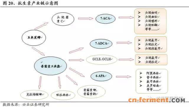 抗生素的原料药和中间体主要有青霉素工业盐、7-ACA、6-APA,7-ADCA等。其中,7-ACA是绝大部分头孢类共同的中间体;6-APA是绝大部分青霉素衍生物(西林类)共同的中间体。
