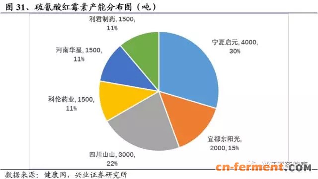与其他原料药不同,硫氰酸红霉素为纯发酵产品,无法人工合成,且其发酵废液中含剧毒的硫氰酸类物质,处理成本较高,新进入企业需面临较高的准入门槛。国内生产的硫氰酸红霉素中,约60%用于出口,出口方式以饲料添加剂为主。在出口国家中,印度占比约70%,份额最高,巴西饲养业增长迅速,未来有望成为第二大出口国。目前,我国硫氰酸红霉素的产能已超过1万吨,年产量已达5000余吨。主要生产企业为:宁夏启元(4000吨)、宜都东阳光(2000吨)、四川山山(3000吨)、科伦药业(1500吨)、河南华星(1500吨)、利君制药(1500吨),其中宁夏启元作为行业龙头,出口额占比最高,为50%,宜都东阳光和河南华星次之。