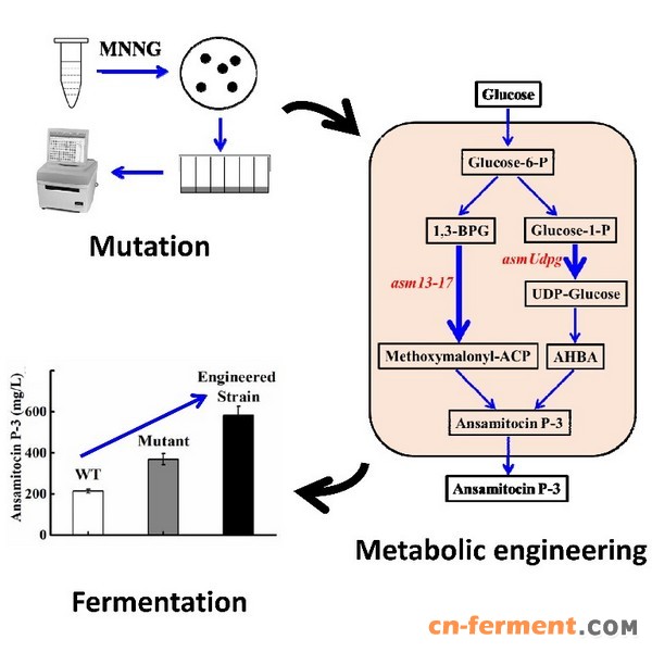 该研究结合传统诱变方法和代谢工程改造提高抗癌药物安丝菌素P-3发酵产量,由博士研究生杜志强、硕士研究生张源为共同第一作者,参与完成者包括团队年轻教师钱志刚、肖晗等。课题组首先从观察到安莎类物质在254nm存在特征吸收峰为基础,设计了高通量筛选方法,从近500株突变株中筛选到一株AP-3高产突变株;紧接着针对该突变株,运用代谢工程手段对AP-3生物合成途径起始单位3-氨基-5-羟基-苯甲酸(AHBA)途径以及甲氧基丙二酰ACP途径进行理性的遗传改造,有效增强了这两个前体途径的供应,最终使AP-3产量达到600 mg/L左右,比至今国内外报道的最高产素水平(美国专利)还要高50%。该研究进一步从基因转录水平和中间代谢物胞内浓度等揭示了产量提升的理论基础,也获得了一些今后可望提高AP-3产量的信息。研究成果将直接有助于降低AP-3的生产成本、促进其商业应用。