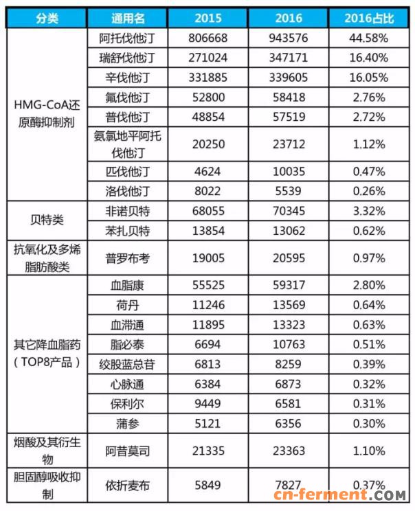 表1 2016年调血脂药物通用名TOP10市场情况(万元)