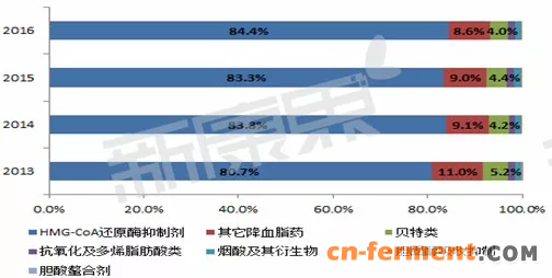 图 4 2013-2016年调血脂药物各亚类占比