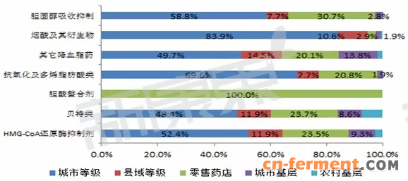 图5 2016年调血脂药物各亚类渠道占比