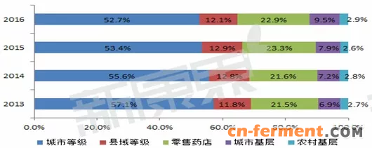 图2 2013-2016年调血脂药物销售渠道情况