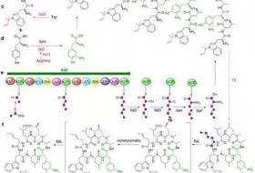 科研人员阐明怡莱霉素的生物合成机制,并利用生物工程技术构建突变株,期望构建新结构衍生物,简化代谢产物组分,并提高目标组分的产量。科研人员对怡莱霉素产生菌进行了基因组测序,根据怡莱霉素的结构特征,通过生物信息分析和基因敲除技术,确定了负责怡莱霉素的生物合成基因簇(图1,a)和骨架结构的生物合成过程(图1,b)。对四个功能基因进行敲除和代谢产物分析,结合前体分子喂养及同位素标记实验,阐明了新颖的I型聚酮合酶IlaE、细胞色素P450氧化酶IlaD、氨基转移酶IlaH和II型硫酯酶IlaF负责稀有结构单元l-2-氨基-4-己烯酸的生物合成(图1,e)。对怡莱霉素生物合成基因簇中的一氧化氮合酶IlaM和细胞色素P450氧化酶IlaN所编码的基因进行敲除和代谢产物分析,及前体分子回补实验,阐明了L-酪氨酸的硝基化过程(图1,d)。通过对怡莱霉素生物合成基因簇中的异戊烯基转移酶IlaO和另外两个细胞色素P450(IlaL和IlaR)所编码的基因进行敲除,代谢产物分析,以及中间体的分离和结构鉴定,阐明了IlaO在怡莱霉素形成过程中负责色氨酸的异物烯基化的前修饰作用(图1,c),IlaL和IlaR这两个酶在怡莱霉素生物合成过程中分别负责亮氨酸末端甲基的羧基化及异物烯基的环氧化的后修饰(图1,f)。通过上述研究,科研人员发现,怡莱霉素生物合成过程中的三个前修饰和两个后修饰过程,并构建高产菌株,定向生产新结构衍生物怡莱霉素E和F。