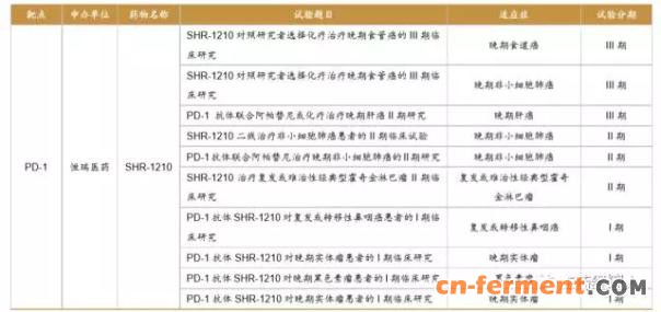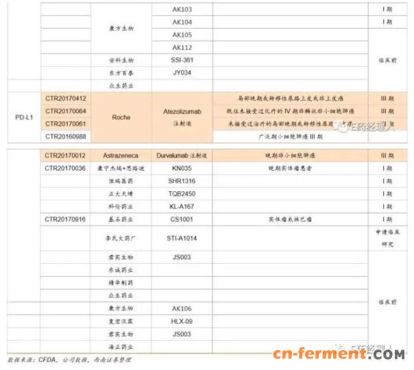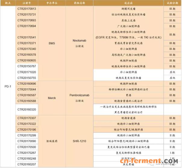 免疫检测点相关的生物药中发展最快、最火的就是PD-1抗体药,PD-1是表达在细胞表面的一种重要免疫抑制跨膜蛋白,以PD-1为靶点的免疫调节对抗肿瘤、抗感染、抗自身免疫疾病及器官移植存活均有重要意义。百时美施贵宝的Opdivo和默沙东的Keytruda均靶向 PD-1,并于2014年上市;随后在2016-2017年,罗氏的Tecentriq、德国默克/辉瑞的 Bavencio和阿斯利康的Imfinzi,靶向 PD-1/PD-L1 信号通路中PD-L1蛋白的药物也相继上市,2017年上半年销量突破40亿美金。除已提出申请的百时美施贵宝外,外企中默沙东、罗氏及阿斯利康的 PD-1/PD-L1 药物在国内均有临床III期正在进行。