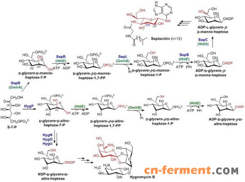 庚糖杀菌素、潮霉素B及大肠杆菌细胞壁脂多糖中庚糖的生物合成过程。其中,绿色括号内标注的是大肠杆菌参与细胞壁脂多糖中庚糖合成的酶。潮霉素B和大肠杆菌LPS合成的酶可以合作生产新颖的ADP-庚糖。