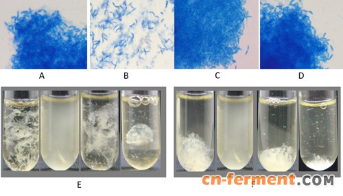 prsR对动胶菌形成菌胶团的作用。A-D,用亚甲美蓝染色的显微照片;E-F,对应于A-D的菌株悬于试管中的状态。