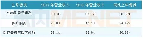 表1:2016-2017年复星医药不同业务板块业绩增长情况(单位:亿元)