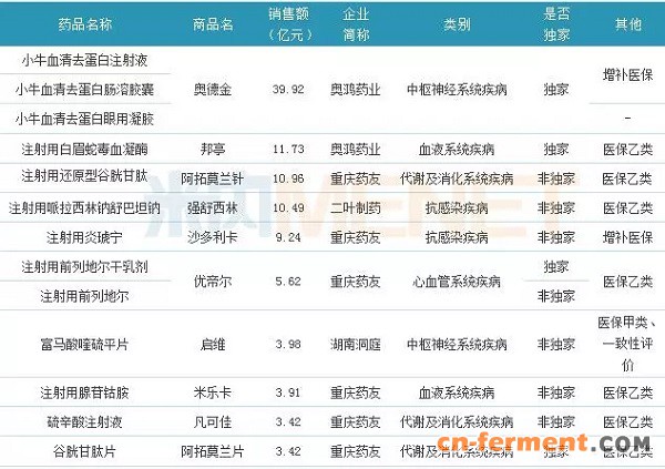 小牛血清去蛋白注射液/小牛血清去蛋白眼用凝胶/小牛血清去蛋白肠溶胶囊为小牛血清去蛋白三种不同剂型,其中注射剂为主打剂型。小牛血清去蛋白注射液,商品名为奥德金,为复星医药子公司奥鸿药业的独家产品,可用于脑部缺血性损害、颅脑外伤等所引起的神经功能缺损,还可用于末梢动脉、静脉循环障碍及其引起的动脉血管病,腿部溃疡,对腿部或其它部位慢性溃疡、烧伤等也有治疗作用。据米内网数据,2016年中国公立医疗机构终端神经系统药物销售额为963.3亿元,同比上一年增长9.48%,其中奥鸿药业的奥德金以4.14%的比例位居榜首。