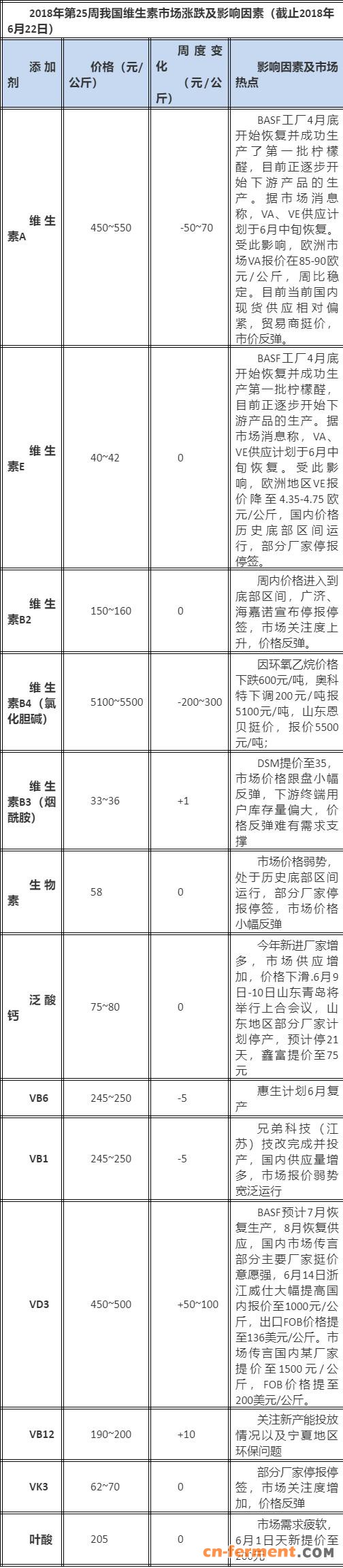 1、2018年第25周中国维生素价格指数变化以涨跌因素一览