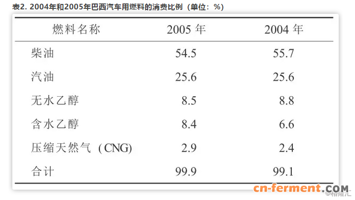 据巴西石油公司介绍,目前全世界可再生能源占总能源消费的14%,而巴西的比例可达到45%(其中包含15%的水力发电)。2004年和2005年巴西汽车用燃料的消费比例见表2。