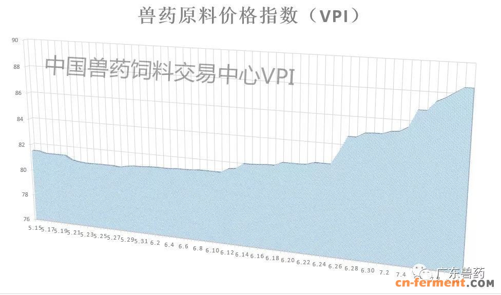 据中国兽药饲料交易中心监测,7月10日,兽药原料价格指数(VPI)为88.46,与月初相比涨幅为4.03%,反应当前兽药原料行情处于上涨态势,且多头趋势较强。