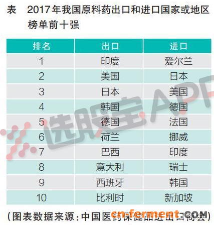 另外,2017年,我国原料药共出口到195个国家和地区,印度为我国最大的原料药出口目的地,全年输入我国原料药货值44.27亿美元,同比增长13.52%,并表现出量价齐升的态势。美国保持在第二的席位,全年进口我国原料药39.2亿美元,同比增长23.84%,是前十强中的最高增长率。