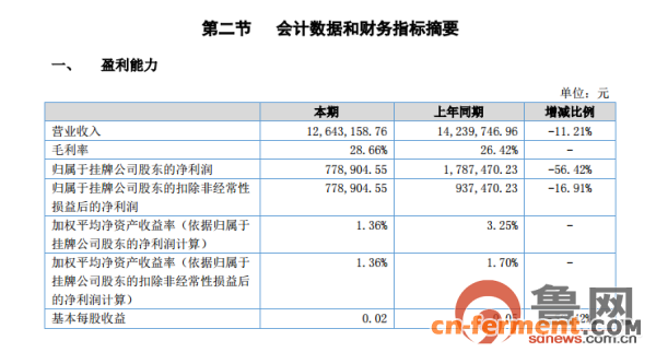 鲁网8月7日讯(记者 张铭芳)鲁网记者今天从全国中小企业股份转让系统获悉,山东泰华生物科技股份有限公司(泰华股份.839444 .OC)近日发布2018年半年度报告,报告期内公司实现营收1264.32万元,同比下滑11.21%;归属于挂牌公司股东的净利润77.89万元,同比下滑56.42%。