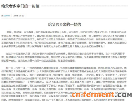 7月20日,泰瑞制药又发布《给父老乡亲们的一封信》。公开信宣称,为了治理环保,泰瑞制药“引进了很多新技术和先进设备,一次又一次的验证,一次又一次的失败,前前后后,两年下来,折腾了八次,花了很多冤枉钱,走了很多弯路。因为我们要解决的发酵异味,是世界性的难题。”