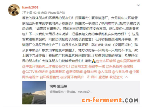 就在外界以为此事能尘埃落定时,一个月后情况再次发生反转。7月14日,网友haerb2008在新浪微博爆料称,“七月初督察组刚离开宁夏,泰瑞药厂立马又开始生产了。就在此时此刻(凌晨两点钟),我从梦中被药厂散发出来的臭味熏醒了,地方政府睁一只眼闭一只眼不作为、欺上瞒下弄虚作假,恶臭扰民问题何时才能得到彻底根治?”