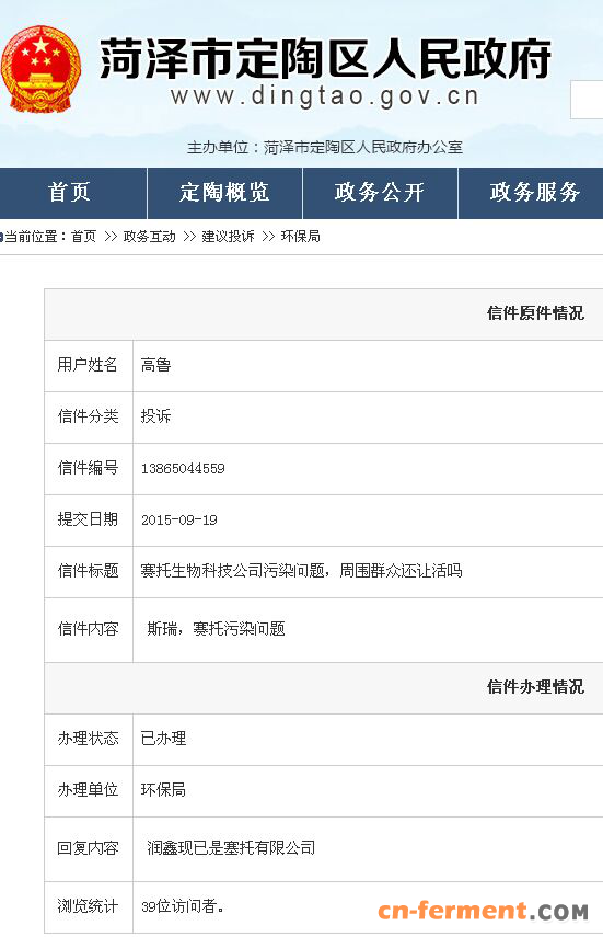 菏泽市定陶区人民政府官网群众投诉赛托生物截图