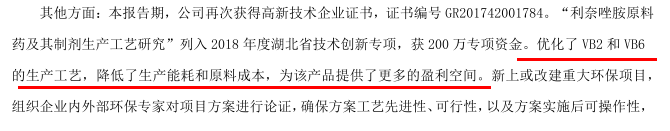 另外,广济药业的财报中显示,去年和今年上半年,维生素B2成本不仅未增,反而还由于改进工艺有所降低。报告称,优化了VB2和VB6的生产工艺,降低了生产能耗和原料成本,为该产品提供了更多的盈利空间。