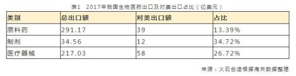 表1 2017年我国生物医药出口及对美出口占比(亿美元)